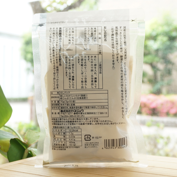 椎茸と昆布だけの本当に自然のだしで、すごく味もおいしくてよかったです。パックになってて使いやすいのもありがたいです。