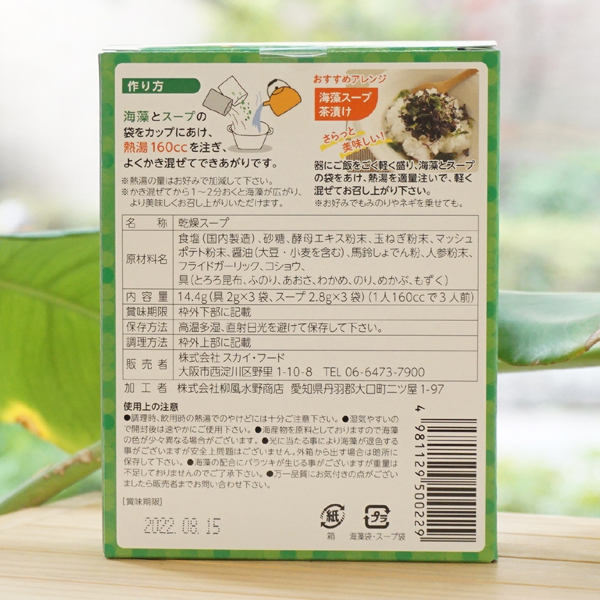 【取扱説明】器に海藻と野菜ブイヨンの袋を開け、熱湯160mlを注いで軽くかき混ぜて2分でできあがり。