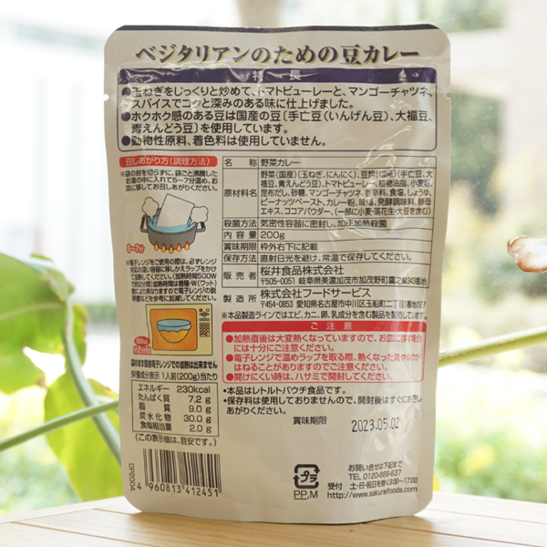 【原料名】国内産野菜(玉ねぎ、にんにく)、国内産豆(手亡豆、大福豆、青えんどう豆)、トマトピューレー、植物性油脂、小麦粉、昆布だし、砂糖、マンゴーチャツネ、香辛料、食塩、しょうゆ、ピーナッツペースト、カレー粉、味噌、発酵調味料、酵母エキス、ココアパウダー(原材料の一部に大豆を含む)