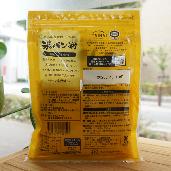 【原料名】米粉(うるち米・新潟産)、食用米油、砂糖(てんさい)、パン酵母、食塩/トレハロース、ph調整剤(酢酸Na)、増粘剤(HPMC)