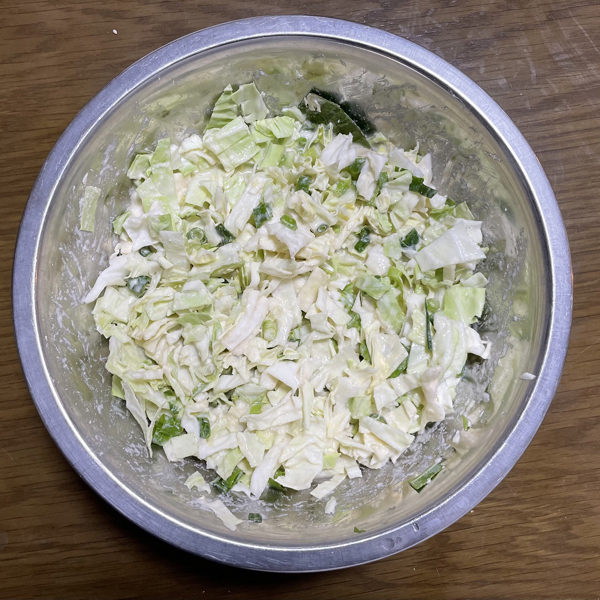 材料はいつも目分量で調合しているのと、インターネットで検索すると色々 出てきますのでここにはレシピは掲載しませんが、キャベツが多すぎるくら いのほうが美味しく焼ける気がします。