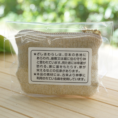 ざしきわらしは日本各地にあらわれ、座敷又は蔵に住む守り神と言われています。 見た者には幸運が訪れる、家に富をもたらす、家が栄えるなどの伝承があります。 本品の素材は、古来より神事に利用される麻を使用しております。