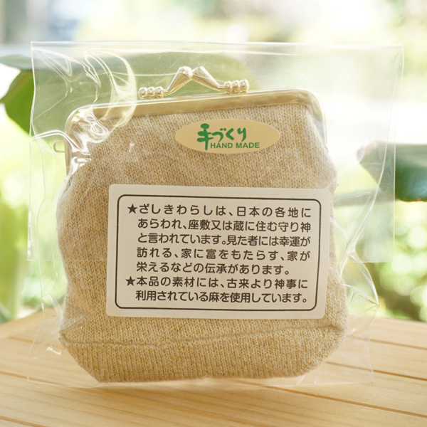 ざしきわらしは日本各地にあらわれ、座敷又は蔵に住む守り神と言われています。 見た者には幸運が訪れる、家に富をもたらす、家が栄えるなどの伝承があります。 本品の素材は、古来より神事に利用される麻を使用しております。