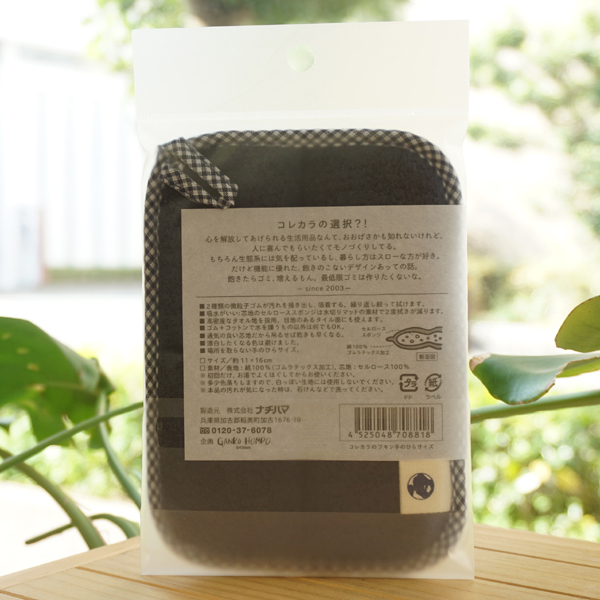 芯地は植物性スポンジ。置き場や見た目に困らない大きさと色あいが使いやすい。食卓や棚などの拭き掃除に!