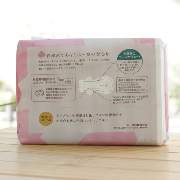■化学素材である高分子吸収材(ポリマー)不使用で女性の身体を冷やしにくく、コットンを使用することで保湿性を高め、カブレにくくなっています。また、コットンは吸湿性にも優れているのでムレにくいです。