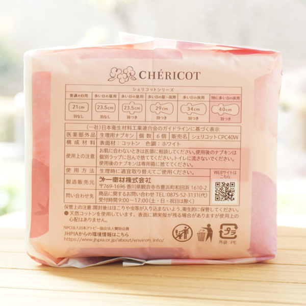 サニタリーパッド 特に多い日の夜40cm(羽つき)/6枚【シェリコット】CHERICOT1