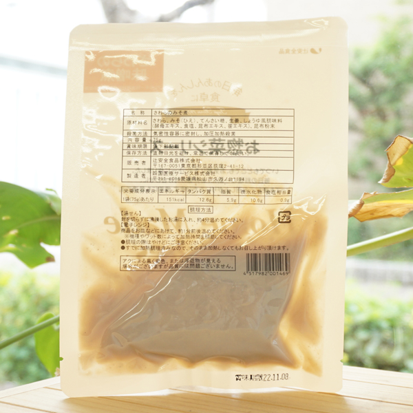 【原料名】さわら、みそ(ひえ)、てんさい糖、生姜、しょうゆ風調味料(酵母エキス、食塩、昆布エキス、笹エキス)、昆布粉末