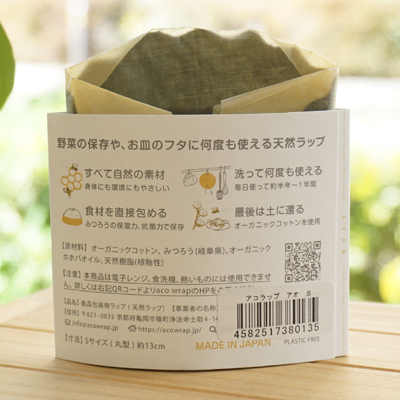 acowrap(アコラップ)といって、オーガニックコットンと岐阜県で採取したミツロウ、オーガニックホホバオイル、天然樹脂の4つの原料で作っている。