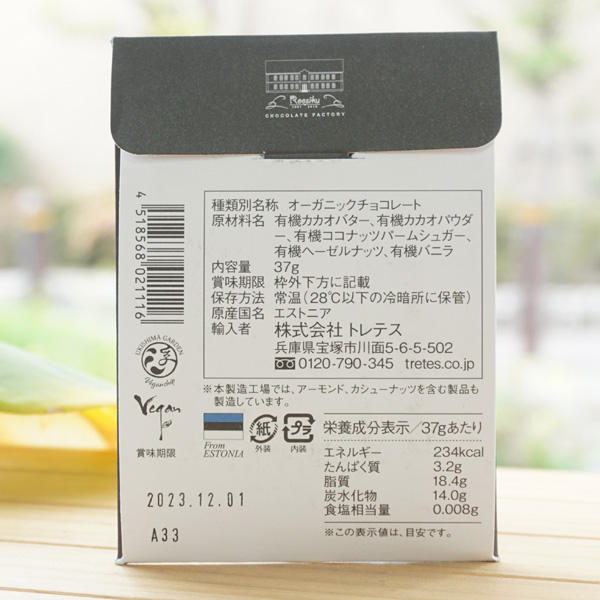 【原料名】有機カカオバター、有機カカオパウダー、有機ココナッツパームシュガー、有機ヘーゼルナッツ、有機バニラ