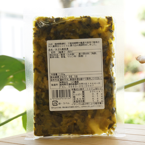 【原料名】高菜(九州産)、漬け原材料[梅酢、麦芽水飴、食塩(天日塩)、ウコン粉(鹿児島産)]
