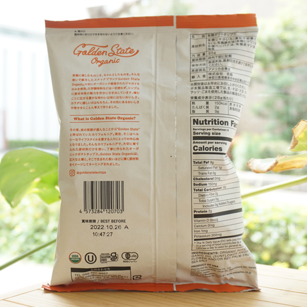 【原料名】有機じゃがいも(アメリカ産)、有機調合油(有機ヒマワリ油・ベニバナ油・赤ヤシ油)、食塩(アメリカ産)