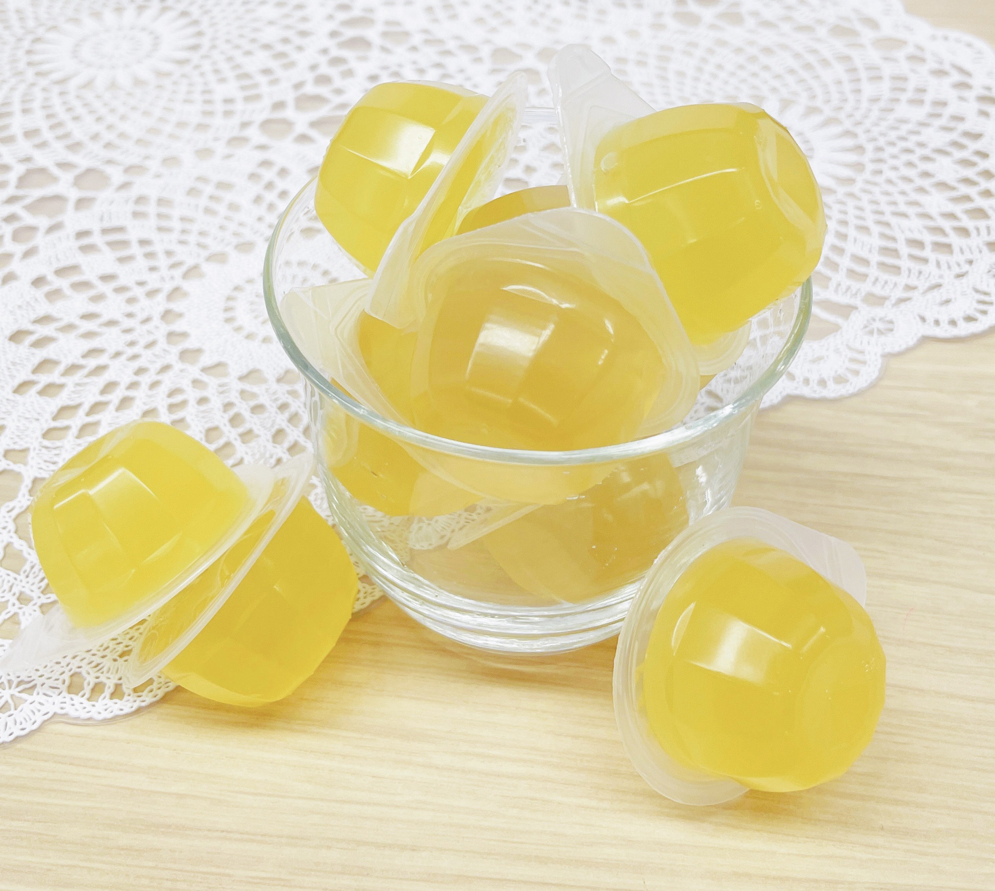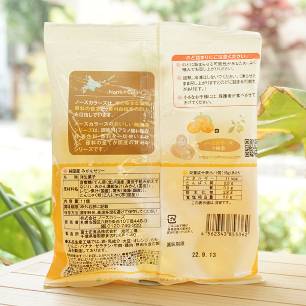 【原料名】含蜜糖(てん菜(北海道産、遺伝子組み換えでない))、みかん濃縮果汁(みかん(国産))、レモン果汁(国産)、寒天(海藻(国産))、こんにゃく粉(こんにゃく芋(国産))