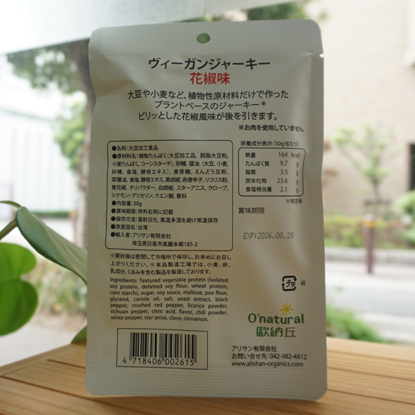 ヴィーガンジャーキー(花椒味)/50g【アリサン】 植物肉乾 VEGAN JARKY O’natural1