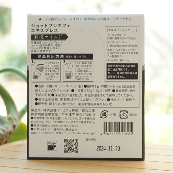 ショットワンカフェエキスプレス 有機マイルド/150g(10g×15袋)【麻布タカノ】1