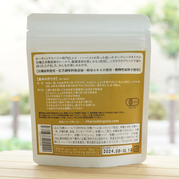 【原料名】有機パーム油(コロンビア製造)、有機玄米粉、有機カレー粉、有機砂糖、食塩、オニオンパウダー、有機りんご果汁、有機味噌(大豆を含む)、有機ガーリックパウダー、有機トマトピューレ、有機ココア、有機ショウガパウダー