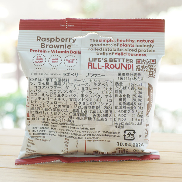 【原料名】デーツ、カシューナッツ、でん粉、濃縮ブドウジュース、ラズベリー、ココアパウダー、ダークチョコレート(カカオバター、ココアパウダー、デーツ)、カカオニブ、えんどう豆タンパク、米タンパク、アセロラチェリーエキス、食塩/ビタミンD3 (コレカルシフェロール)、VB12(メチルコバラミン)