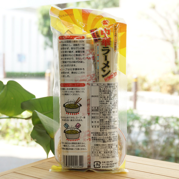 麺は無かん水麺で油脂を一切使用せず、国内産小麦100%を使用しています。 スープは化学調味料を使用せず、素材にこだわりました。