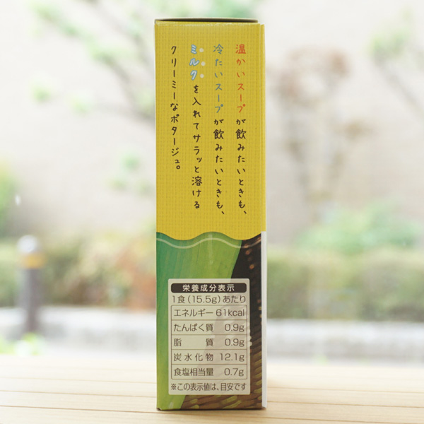 【原料名】スイートコーンパウダー(スイートコーン(北海道))、麦芽糖、コーンスターチ、砂糖、デキストリン、食塩、酵母エキスパウダー、食用植物油脂、野菜エキスパウダー、チキンエキスパウダー、玉ねぎエキスパウダー、馬鈴薯でん粉、うきみ(パセリ)