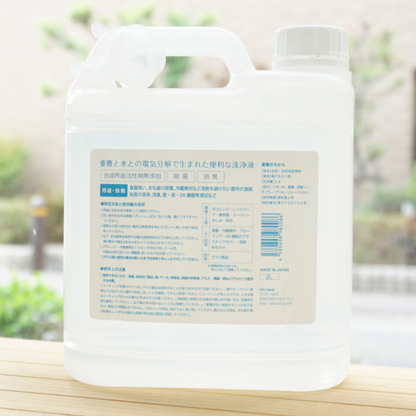 重曹と水との電気分解で生まれた便利な洗浄液、弱アルカリ性電解水。
