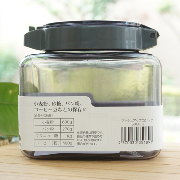 エンバランスプッシュアップコンテナは1.6Lと1.1Lの2サイズ展開。 調味料やお出汁パック、コーヒー、紅茶などの茶葉、シリアルなど 食品を入れるのに丁度良いサイズです。 サイズ違いでも同じサイズで揃えても、すっきりオーガナイズ。