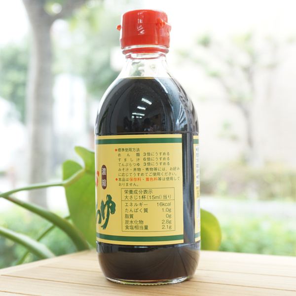 ■丸大豆仕込みでじっくりと熟成させた純正醤油に、かつおぶしエキスとこんぶエキスを使用した濃縮タイプのつゆ