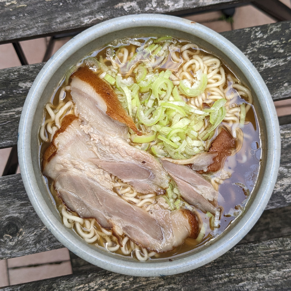 【原料名】めん[小麦粉(小麦(国産))、小麦たん白、食塩]、しょうゆ、砂糖、なたね油、食塩、チキンエキス、焙煎にんにく紛末、にんにくペースト、ごま油、しいたけエキス、生姜粉末、オイスターエキス、昆布粉末、こしょう粉末、(一部に小麦・ごま・大豆・鶏肉を含む)