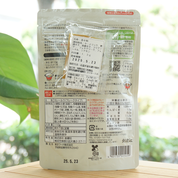【原料名】小麦粉(小麦(国産))、有機植物油脂(有機べに花油、有機パーム油、有機オリーブ油)、砂糖、カレー粉、食塩、粉末野菜(トマト、玉ねぎ、にんにく、にんじん)、酵母エキス、りんご果汁、味噌、麦芽エキス、別添小袋(香辛料:ターメリック、青唐辛子、赤唐辛子、コリアンダー、フェネグリーク、フェンネル、シナモン)、(一部に小麦・大豆・りんごを含む)