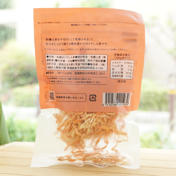 山上の北条風早園地で育てた有機人参を千切りにし乾燥させました。甘みをしっかり感じる風味豊かな切り干し人参です。原料約300g分の有機人参が、乾燥後25gに凝縮されています。