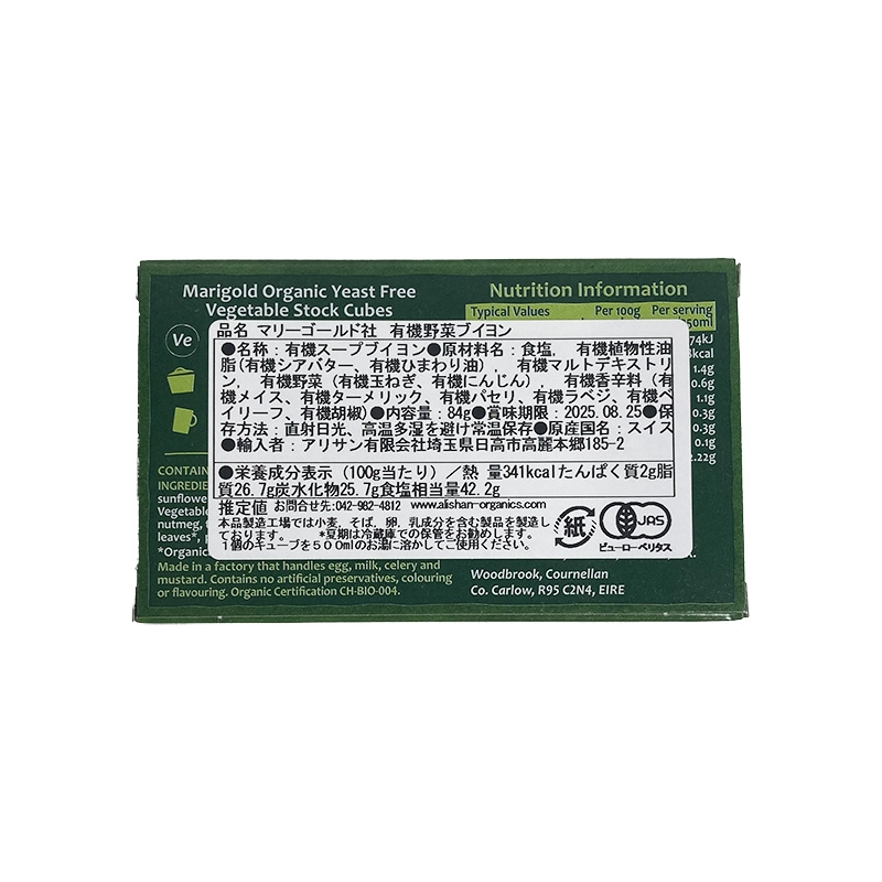 1パックに8個入り(10.5g x 8 個) オーガニック、ヴィーガン、酵母エキスフリーのブイヨンキューブ。 1個のキューブを500mlのお湯に溶かしてご使用ください。 スープ以外にも野菜炒め、ホワイトソース、チャーハン等、幅広くお料理の味付けにご使用いただけます。 夏期冷蔵便での発送となります。
