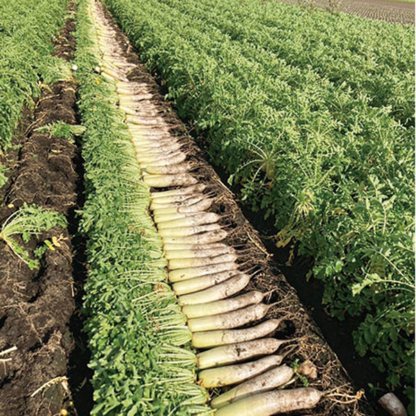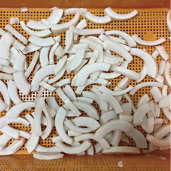 国内(主に北海道産と九州産)で契約栽培した大根をおでん用に加工する工程で、ぶ厚くむいた皮=皮がついた部分だけの大根が大量に発生します。