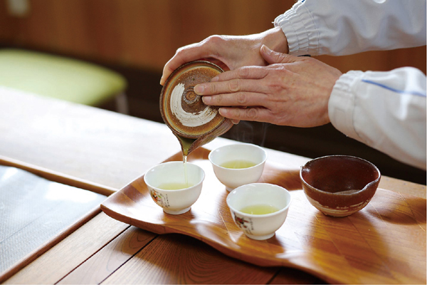 「5分間ほど充分に沸騰させたお湯を使います。煎茶の場合は70℃まで湯冷まししてから急須にゆっくり注ぎ、蓋をして1分ほど蒸らし、湯呑みに少しずつ注ぎ分けて最後の一滴まで注ぎきる。二煎目はお湯を冷まさずに入れて手早く注ぎきる」