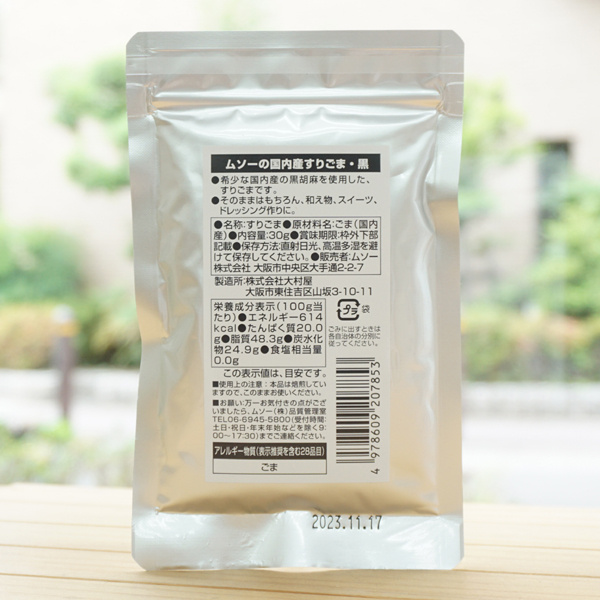 すりごま(黒)/30g【ムソー】 国内産 黒胡麻を丹念にすり上げた、風味ゆたかな1
