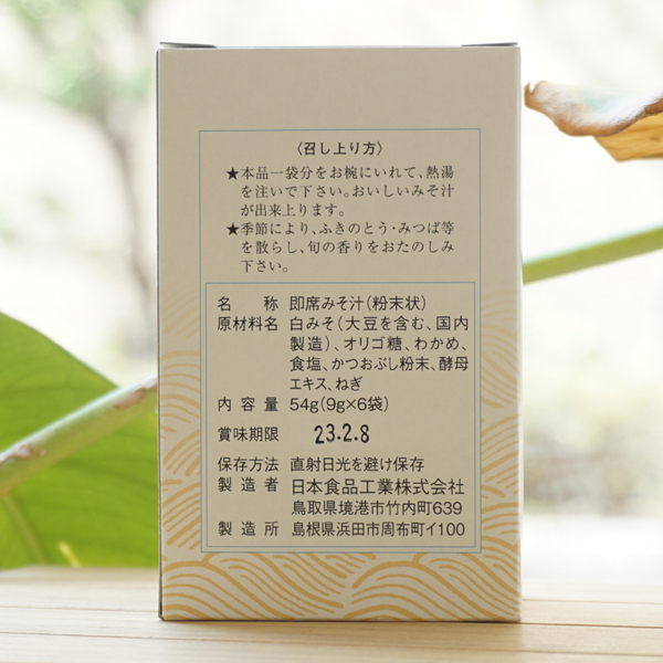 【原料名】白みそ(大豆、小麦)、わかめ、ぶどう糖、食塩、かつおぶし粉末、酵母エキス、ねぎ