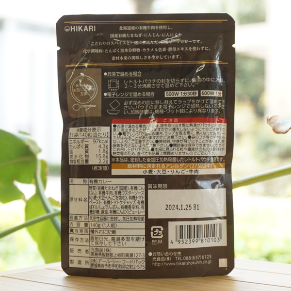 【原料名】野菜(有機たまねぎ(国産)、有機にんじん)、有機牛肉、有機ウスターソース(小麦・大豆・りんごを含む)、有機トマトペースト、有機トマトケチャップ、有機ばれいしょでんぷん、有機香辛料、有機砂糖、食塩、有機にんにくピューレー