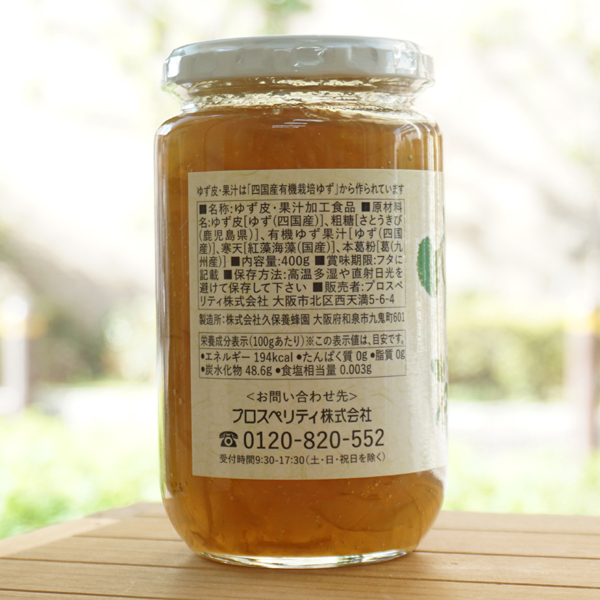 【原料名】ゆず皮【有機ゆず(四国産)】、粗糖(鹿児島産)、有機ゆず果汁(四国産)、寒天(国内産)、本葛粉(九州産)