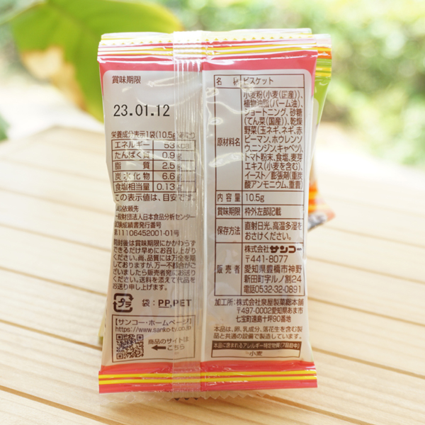 乾燥野菜(玉ネギ・ネギ・赤ピーマン・ホウレンソウ・ニンジン・キャベツ)、トマト粉末、食塩、麦芽エキス、イースト、膨脹剤(重炭酸アンモニウム・重曹)