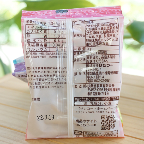 【原料名】小麦粉(国内産100%)、砂糖(てん菜糖)、鶏卵、豆乳粉末(大豆(国産))、植物油脂(パーム油・米油)、脱脂粉乳/卵殻未焼成カルシウム(卵由来)、膨脹剤(重曹)