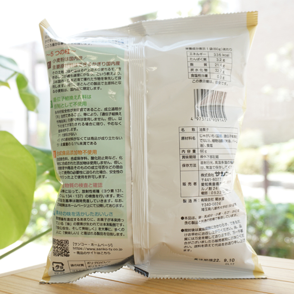【原料名】じゃがいも(国産、遺伝子組換えでない)、植物油脂(米油、パーム油)、食塩