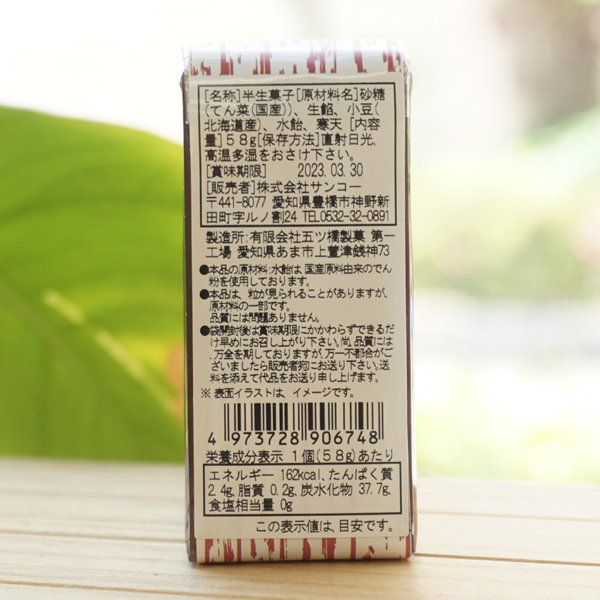 【原料名】砂糖(てん菜糖)、生餡、小豆、水飴、寒天