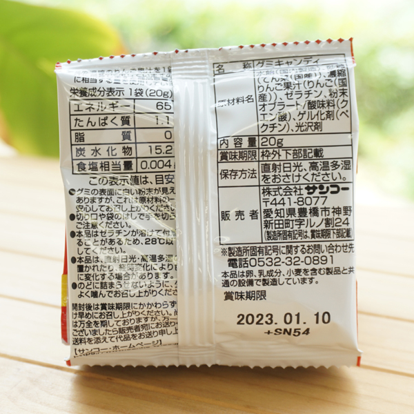 【原料名】水飴(甘藷(国産))、砂糖(てん菜(国産))、濃縮りんご果汁(長野県産)、ゼラチン、粉末オブラート(馬鈴薯でん粉)/酸味料(クエン酸)、ゲル化剤(ペクチン)、光沢剤、植物レシチン
