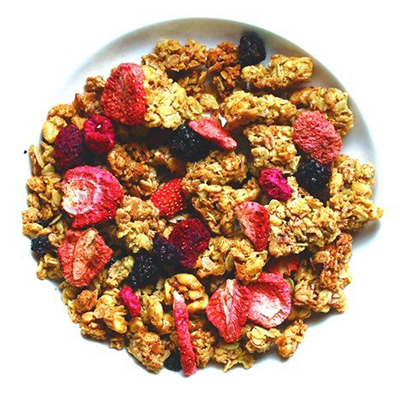 ■オーツ麦・小麦などの麦類を食用油脂と混ぜてオーブンで焼き、乾燥ベリーで味付けをした、シリアル食品の一種です。本品は4種のドライベリー(ストロベリー・ラズベリー・ブラックベリー・ブルーベリー)のブレンドです。ベリーの酸味が甘さの中にきわだちます。