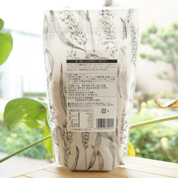 【原料名】有機オーツ麦フレーク、有機砂糖、有機ヒマワリ油、有機乾燥ココナッツ、有機スペルト小麦パフ、有機オーツ麦粉、有機乾燥果実(ストロベリー、ブラックペリー、ラズベリー、ブルーベリー)