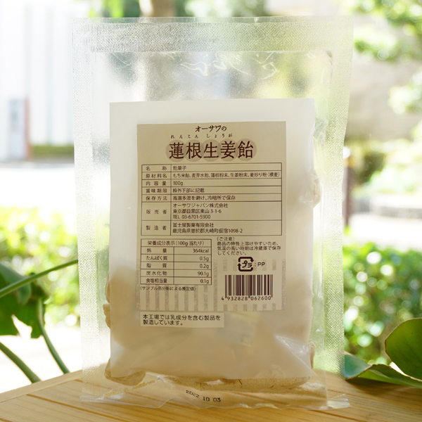 【取扱説明】蓮根と生姜の配合量に苦心しました。幅広い年齢層に受け入れられるよう、生姜の辛味というより、香りが立つように仕上げました。乾燥した季節の喉にやさしい飴です。