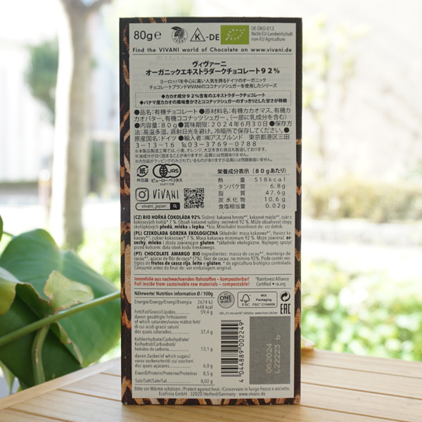VIVANI オーガニック ファインダークチョコレート92%/80g【アスプルンド】 Feine Bitter 92% Cacao Panama2