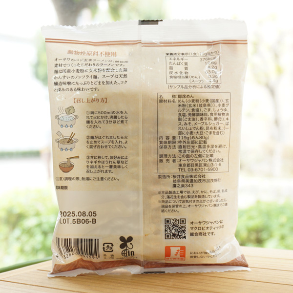 【原料名】めん【小麦粉[小麦(愛知県)]、玄米粉[玄米(岐阜県)]、小麦グルテン、食塩(シママース)】、スープ[胡麻(南米、アフリカ他)、醤油、食塩(シママース)、醗酵調味料、胡麻油、香辛料(玉ねぎ、にんにく、ねぎ、唐辛子)、酵母エキス、味噌、メープルシュガー、馬鈴薯でん粉、昆布粉末]