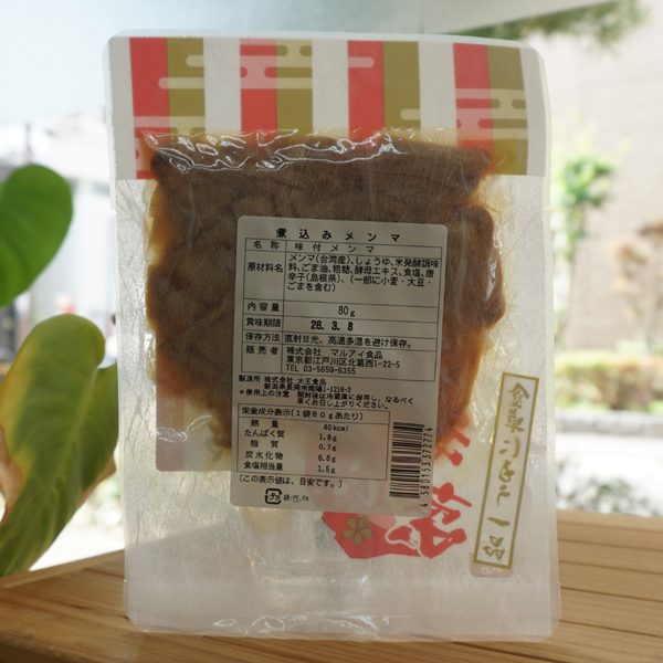 【原料名】メンマ(台湾産)、しょうゆ、米発酵調味料、ごま油、粗糖(鹿児島産)、酵母エキス、食塩(球美の塩)、唐辛子(島根産)