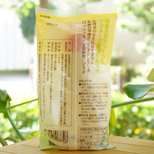 【原料名】なたね油、豆乳・りんご酢(国内産)、有機白味噌、食塩(海の精)、メープルシュガー(カナダ産)、マスタード(カナダ産他)、白こしょう(インドネシア産)