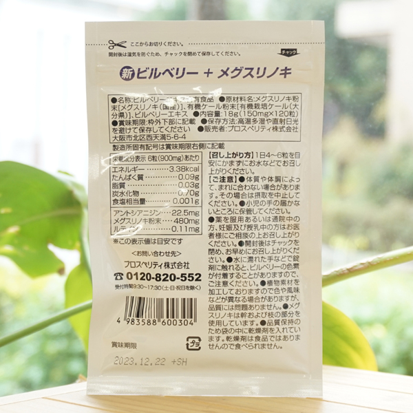 【原料名】メグスリノキ粉末(国内産)、有機ケール粉末(大分産)、ビルベリーエキス(フィンランド・スウェーデン産)