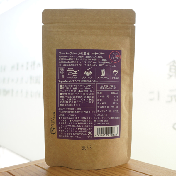 【取扱説明】スーパーフードとして今話題のマキベリーを丸ごとフリーズドライしパウダーにしました。程よい酸味でヨーグルトやスムージーなど様々なものに合います。
