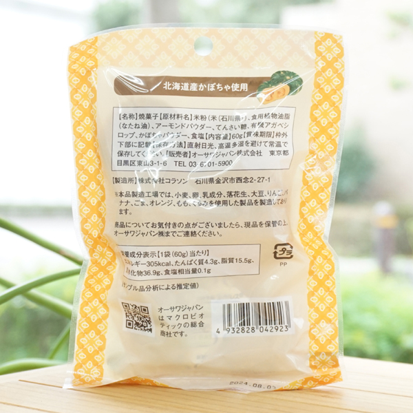 【原料名】米粉[米(石川県)]、なたね油、アーモンドパウダー[アーモンド(アメリカ)]、てんさい含蜜糖、有機アガベシロップ、かぼちゃ粉末(北海道)、食塩(珠洲の塩)